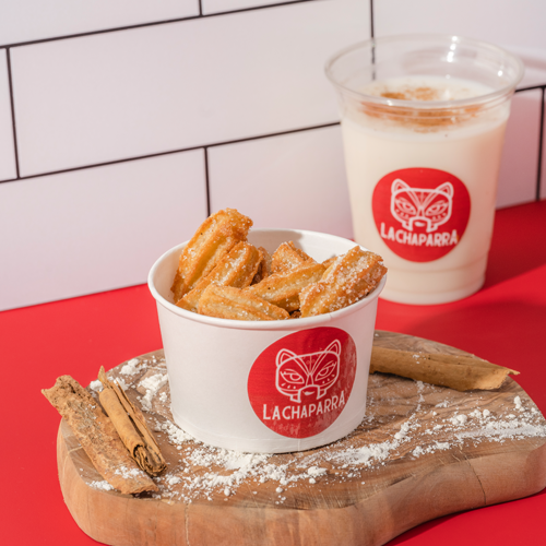 120 Gr de minichurros con topping de arequipe y agua de horchata de 12 oz.