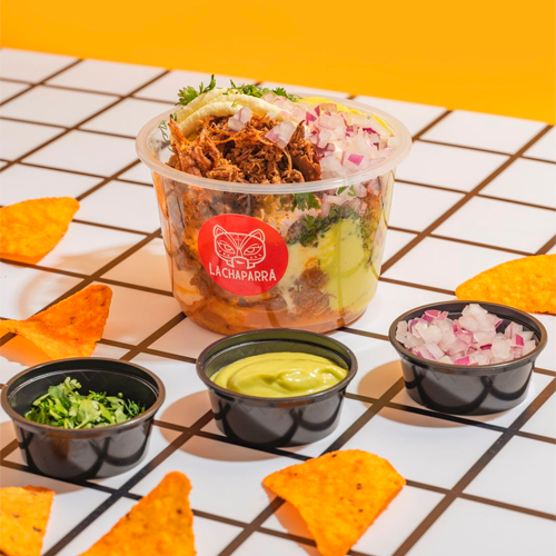 Deliciosa mezcla de doritos con carne de birria de res, cilantro, cebolla, guacamole de la casa , crema agria, queso doble crema; remojados con un toque de caldito de birria.