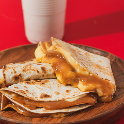 1 Quesadilla de tortilla de harina, arequipe esparcido, queso doble crema y agua de horchata de 12 oz.