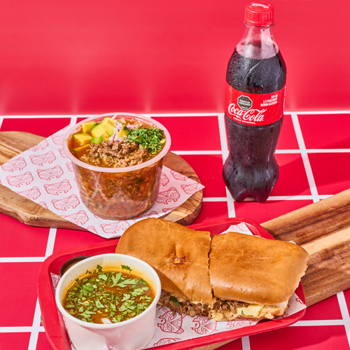 1 Mini chaparramen caldo de birria con cilantro 14 oz, aguacate en trocitos, cebolla cilantro y carne de res con noddles + deliciosa torta de birria con: pan brioche, cilantro, queso (3 tajadas gratinadas), cebolla y carne de birria de res + caldo de birria y coca cola 250ml