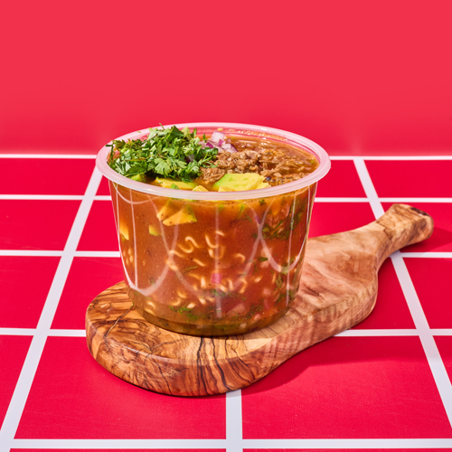 Caldo de birria con cilantro 16 oz, aguacate en trocitos, cebolla cilantro y carne de res con noddles.